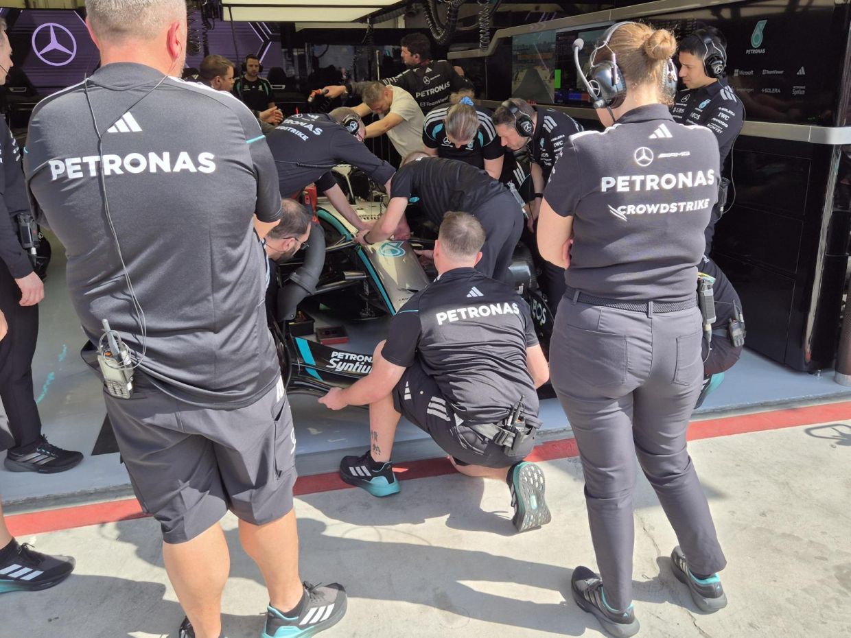 Механики «Мерседеса» только что пять минут не могли снять переднее антикрыло с болида Расселла. И такое бывает.