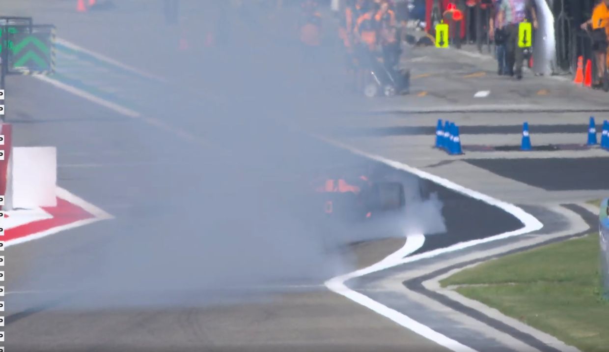 Норрис как следует подымил на въезде на пит-лейн, отрабатывая сверхпозднее понижение до лимитатора.