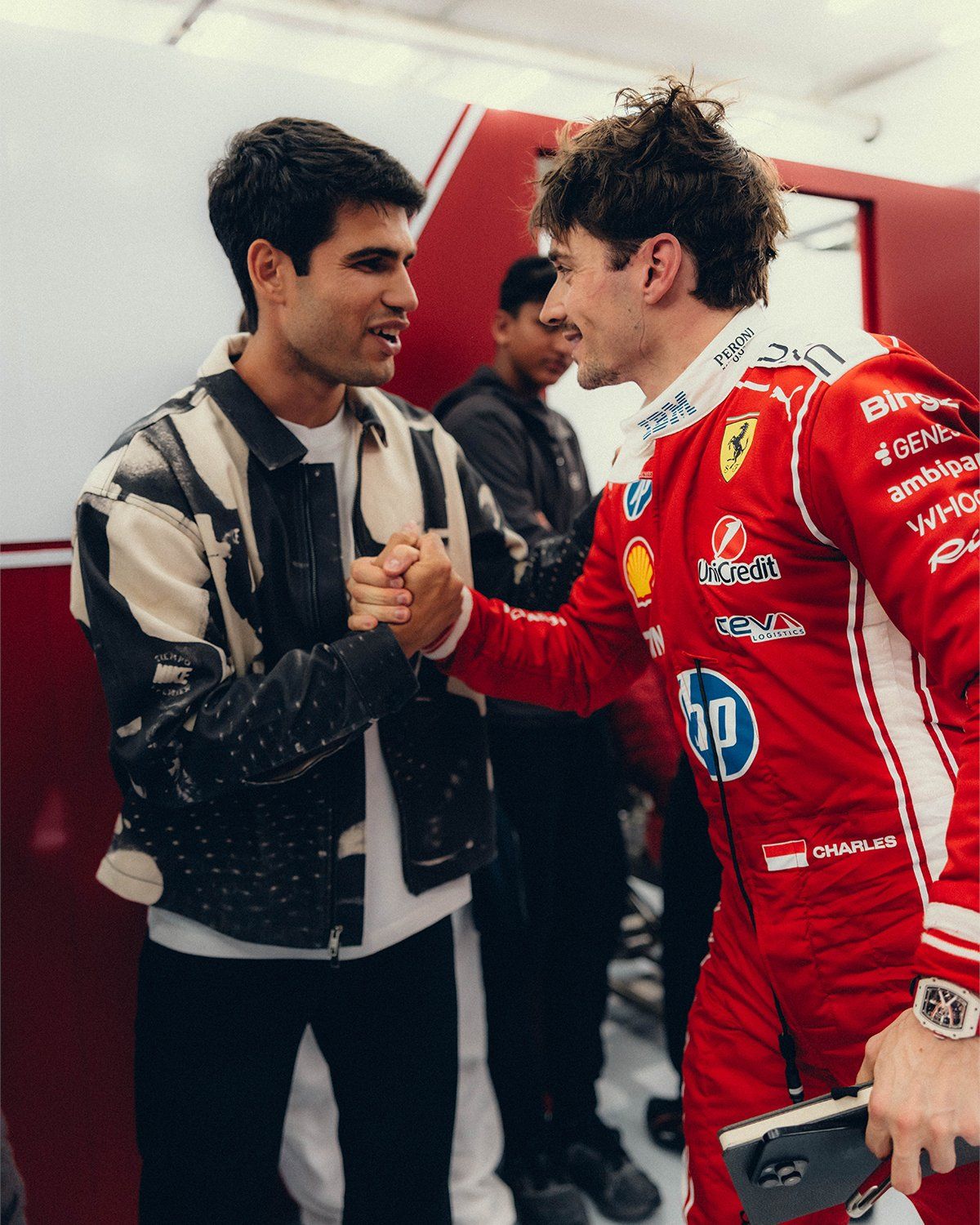 Пресс-служба итальянского коллектива поделилась фотографиями с визита Алькараса в гараж команды и встречи его с гонщиками — монегаском Шарлем Леклером и семикратным чемпионом мира британцем Льюисом Хэмилтоном.