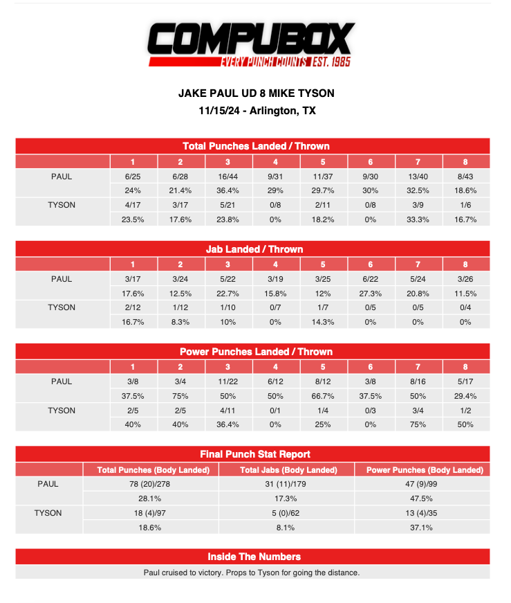 Болельщики увидели восьмираундовый поединок, исход которого пойдёт в профессиональный рекорд бойцов. Соответственно, для Тайсона это первый не выставочный бой за последние 19 лет. Джейк Пол проведёт 12-й поединок в карьере, его текущий рекорд — 10-1. Изначально бой должен был состояться ещё летом, однако из-за проблем со здоровьем у Железного Майка он был перенесён.