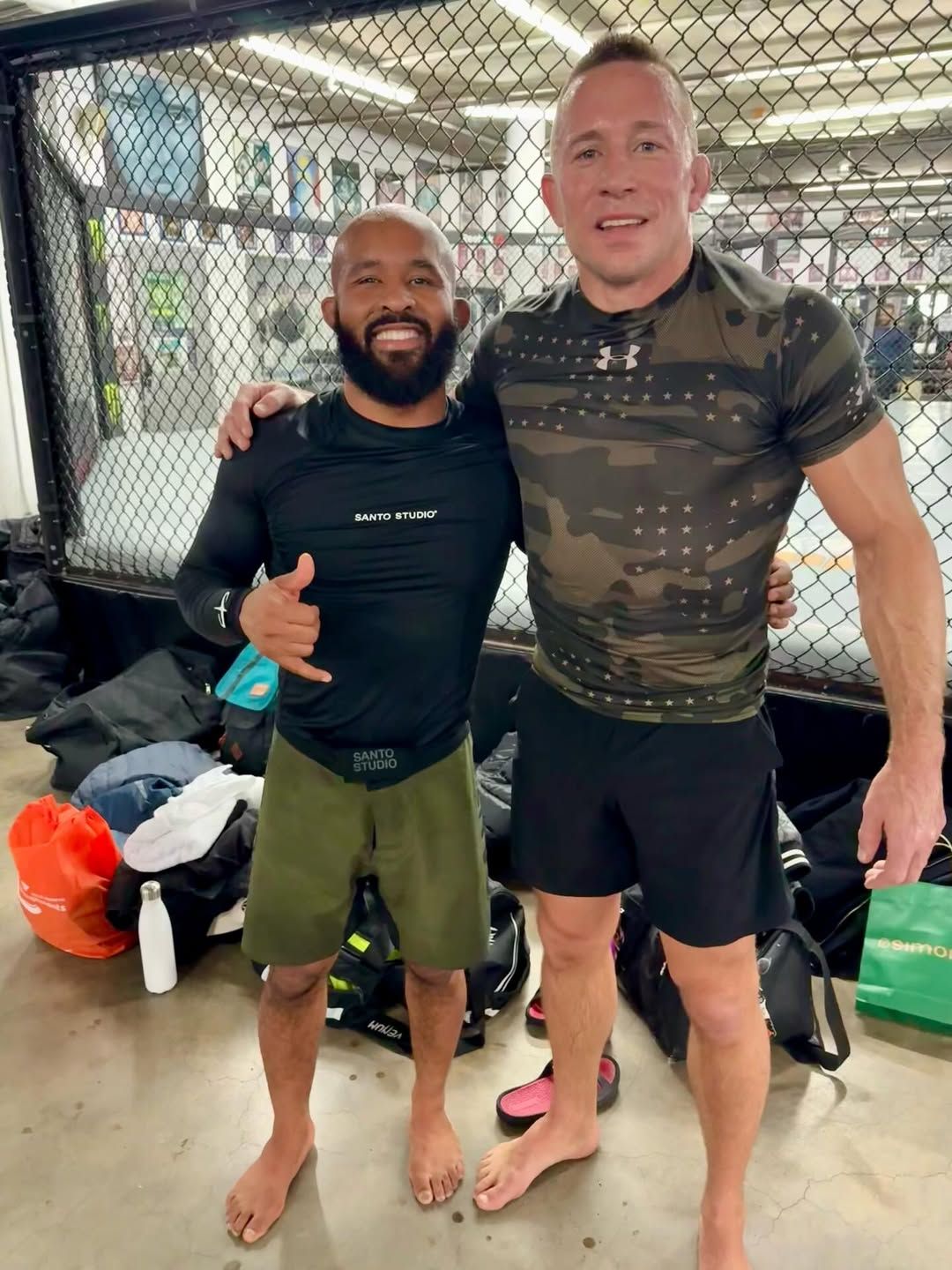 Именитый канадский боец смешанных единоборств (ММА) бывший чемпион UFC в двух весовых категориях Жорж Сен-Пьер разместил новый пост на своей странице в социальных сетях, где поделился с подписчиками свежей фотографией. Канадец показал снимок с экс-обладателем титула лиги Даны Уайта в наилегчайшем весе Деметриусом Джонсоном.