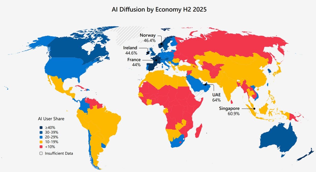 Россия расположилась в рейтинге на 119-м месте: по данным Microsoft, ИИ-сервисами в стране пользуются лишь 8% жителей. При этом отмечается, что авторы исследования использовали данные по IP, поэтому они могли быть искажены.