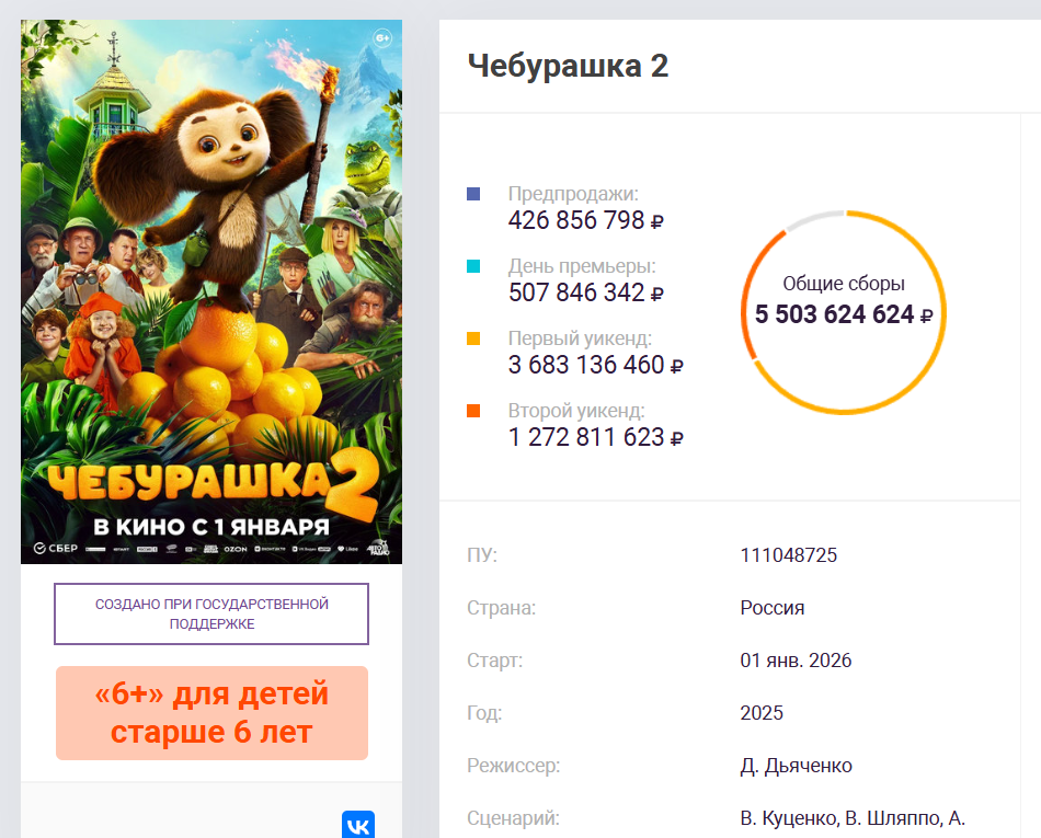 21 января сборы фильма «Чебурашка 2» достигли 5,5 млрд рублей. Такого результата лента добилась на 21-й день проката — премьера картины состоялась 1 января. Фильм продолжает оставаться лидером российского проката, обгоняя эротический триллер «Горничная» и сказку «Буратино».