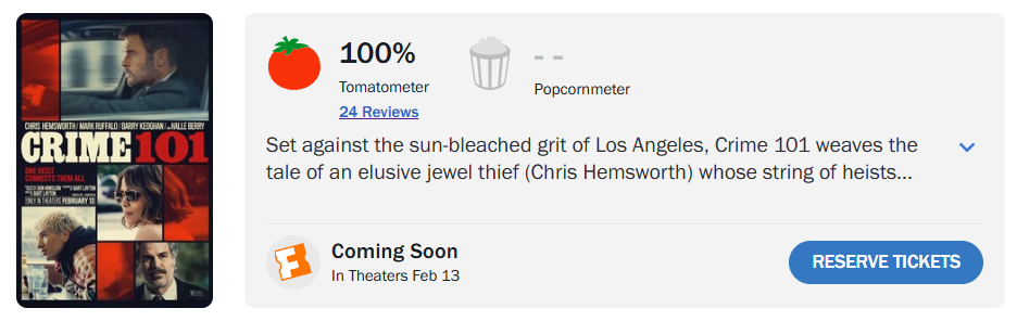 13 февраля состоится мировая премьера фильма «Ограбление в Лос-Анджелесе» — новой криминальной картины с Крисом Хемсвортом и Марком Руффало в главных ролях. Многие критики уже посмотрели ленту и высоко оценили её: на агрегаторе Rotten Tomatoes она получила 100% свежести.