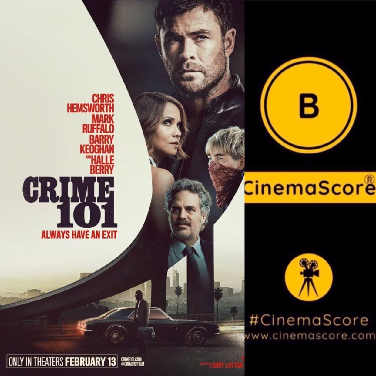 13 февраля состоялась мировая премьера фильма «Ограбление в Лос-Анджелесе» — новой криминальной ленты, с Крисом Хемсвортом и Марком Руффало в главных ролях. На следующий день компания CinemaScore опубликовала рейтинг ленты от зрителей, которых опросили после окончания сеанса.