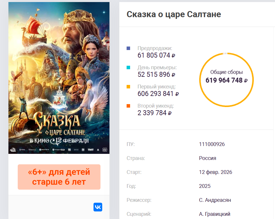 15 февраля сборы фильма «Сказка о царе Салтане» достигли 619 млн рублей. По данным ЕАИС, такого результата картина добилась на четвёртый день с момента выхода — премьера состоялась 12 февраля. Лента остаётся лидером проката, обгоняя фильмы «Чебурашка 2» и «Горничная».