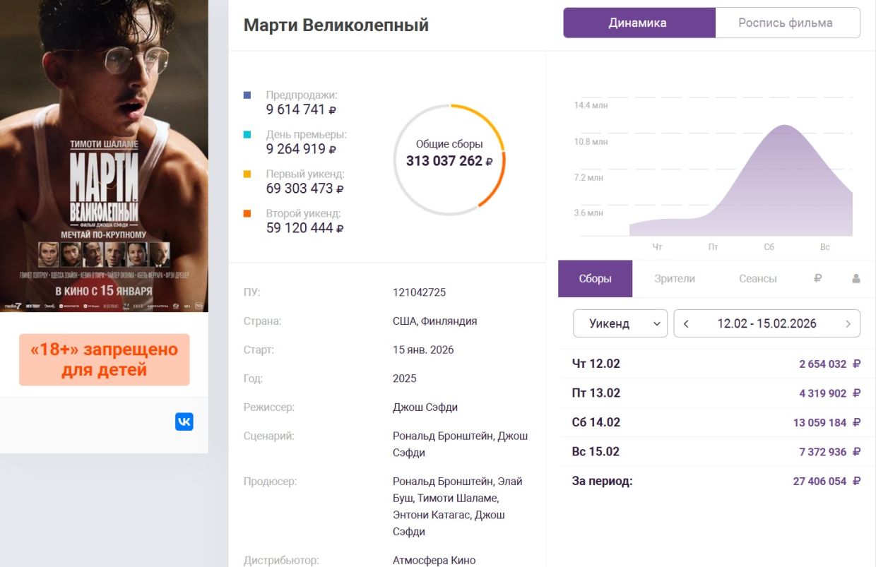 Тем временем общие сборы «Марти Великолепного» приближаются к отметке в $ 150 млн. Картина уже стала самым кассовым фильмом студии А24 и получила девять номинаций на предстоящую премию «Оскар»-2026, включая возможную награду в категории «Лучший фильм».