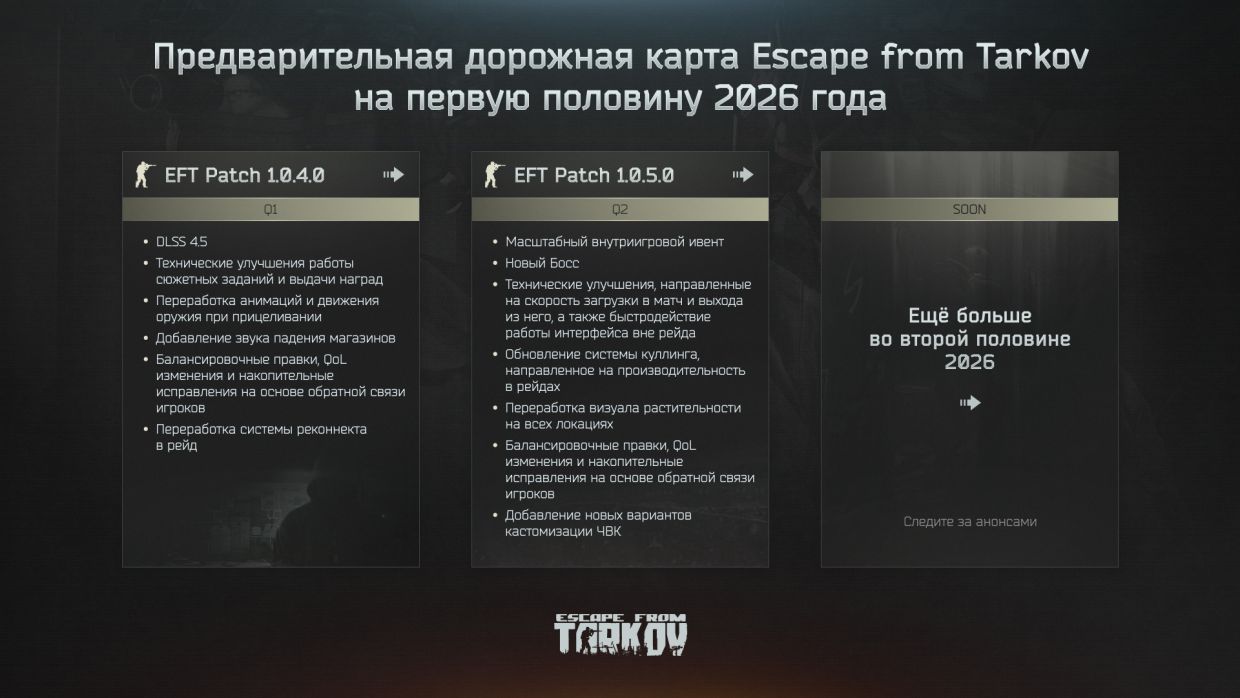 Студия Battlestate Games рассказала о будущих обновлениях своего популярного шутера Escape from Tarkov. Разработчики представили информацию о двух крупных апдейтах, которые выпустят в 2026 году.