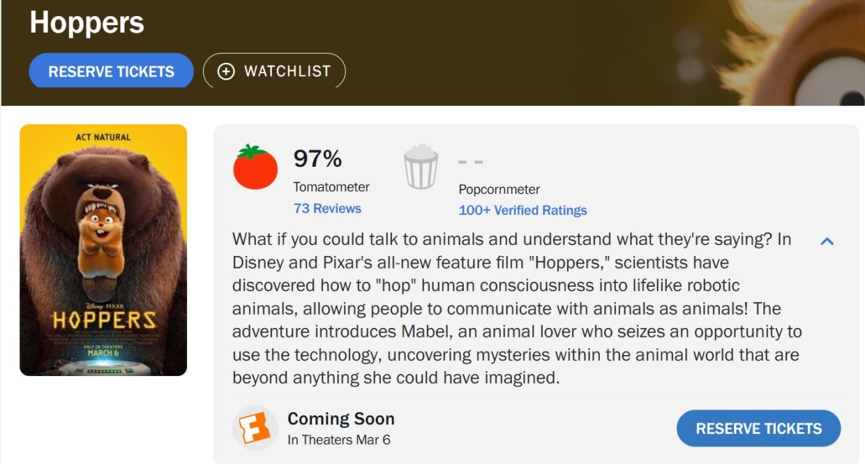 «Прыгуны» — это один из лучших фильмов Pixar за десять лет. Это призыв к зрителям, молодым и взрослым, о важности сохранения природы и понимании того, что все живые существа — часть чего-то большего.