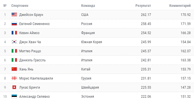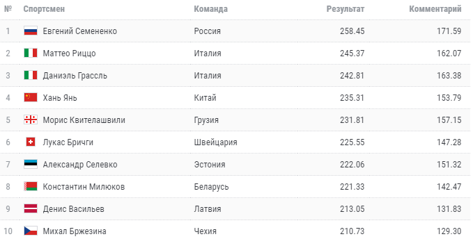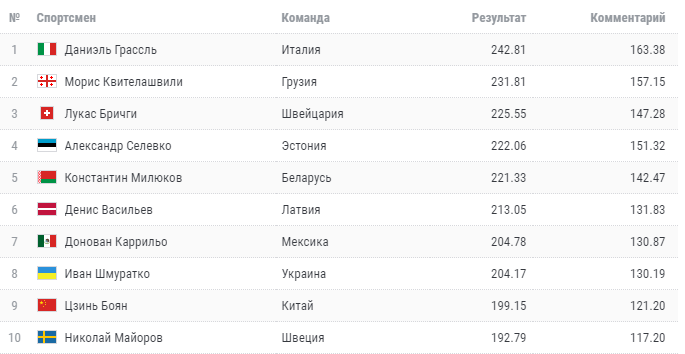 Михаил Коляда стал пятым (272,04 балла), Евгений Семененко — восьмым (258.45). Россияне остались без медалей, зато вернули максимальную квоту на Олимпиаду. Молодцы!