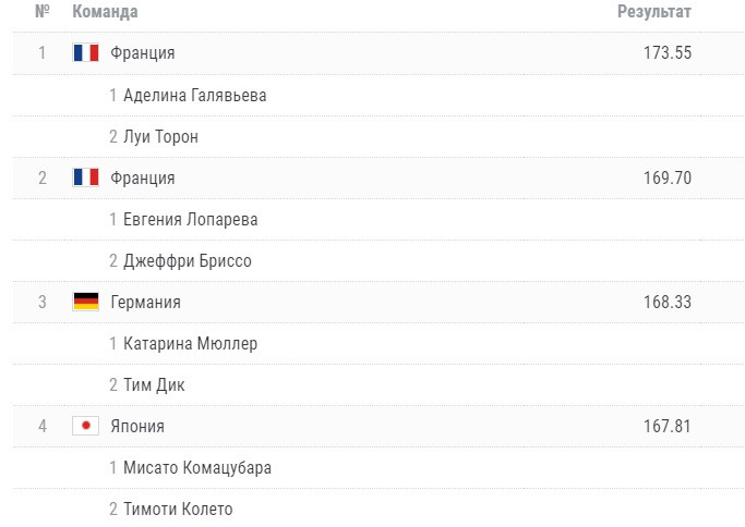 Достойно себя показали Тиффани и Джонатан, но не смогли выбраться на первое место. Буквально шесть сотых балла пара из России уступила американцам Гавайек и Бейкер. Очень жаль, конечно. Но вся борьба за медали ещё впереди.