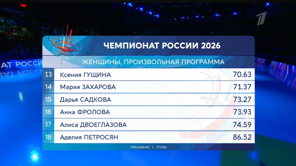 Но, Маша, не расстраиваться! Это дебют для Захаровой на чемпионате России, несмотря на то, что ей уже 18 лет. Президент Федерации фигурного катания России Антон Сихарулидзе показал большой палец вверх и оценил. Баллы за обе оценки: 217,73. Обыграла Софью Муравьёву.