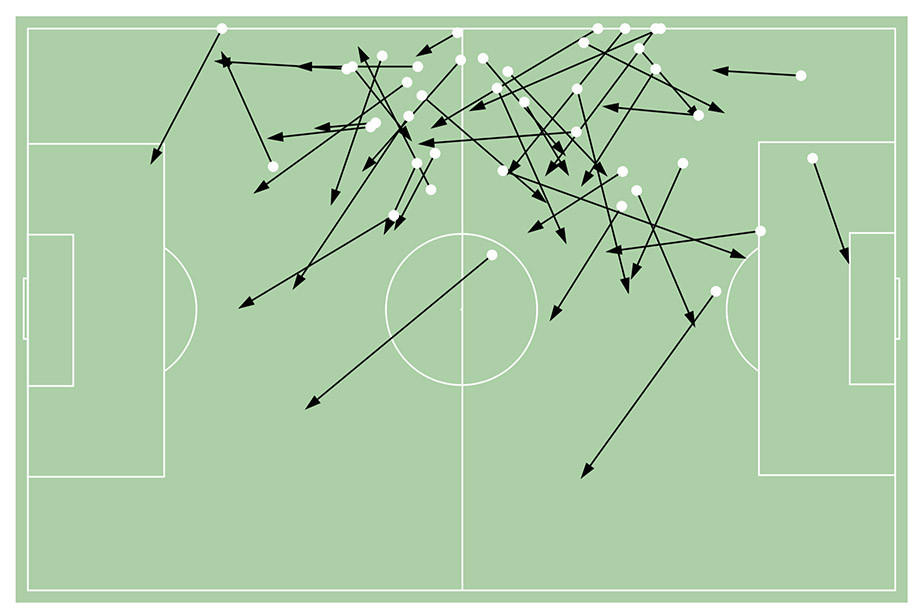 В дерби правый защитник не проявил себя в атаке никак. В дриблинг не шёл (одна неудачная попытка), не выполнил ни одной передачи в чужую штрафную (единственная на изображении снизу – это аут), все пасы следовали ближнему, и иногда с потерей темпа.