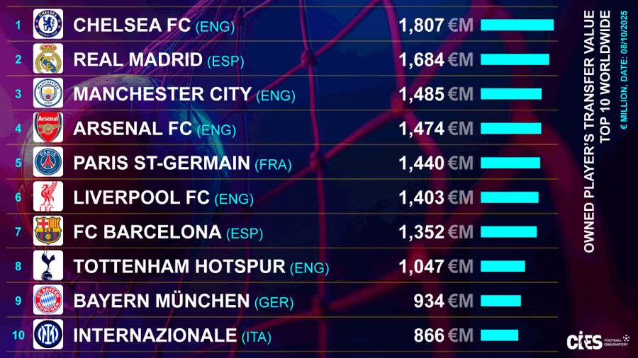 Топ-10 клубов по суммарной трансферной стоимости игроков по версии CIES (октябрь-2025):