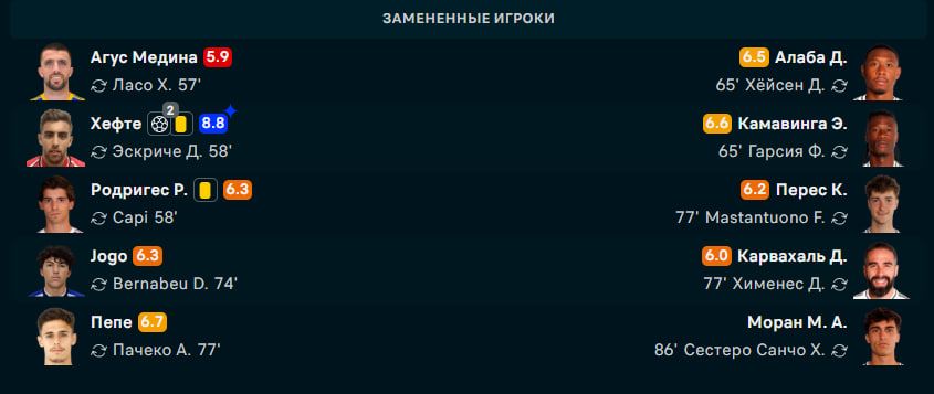 Наивысшую оценку в составе «Реала» получил турецкий атакующий полузащитник Арда Гюлер (7,7). Среди всех игроков встречи наивысший рейтинг Flashscore выставил форварду «Альбасете» Хефте Бетанкору — 8,8. Испанец вышел на замену на 58-й минуте, отметился дублем, включая победный гол, и получил жёлтую карточку.