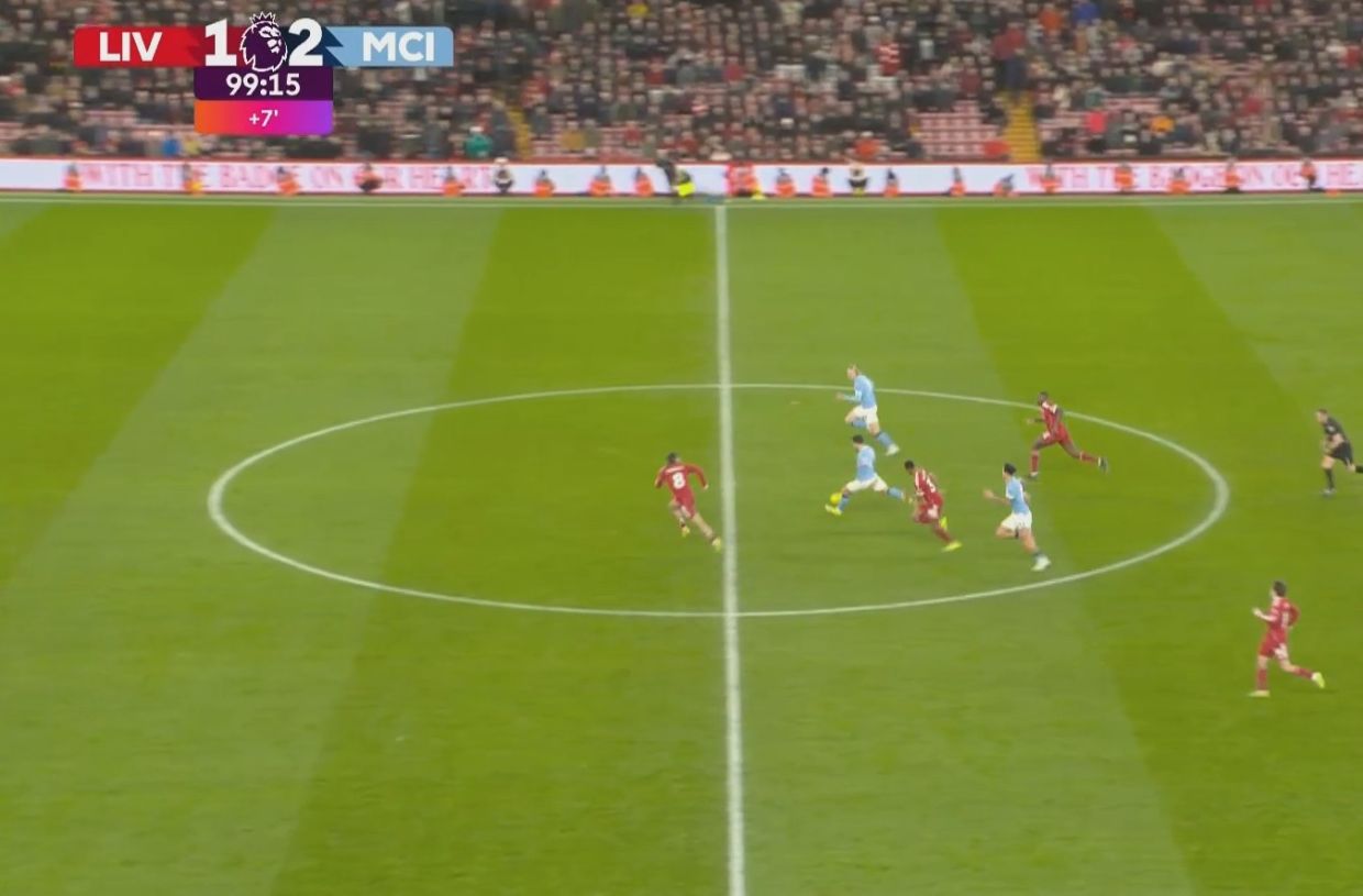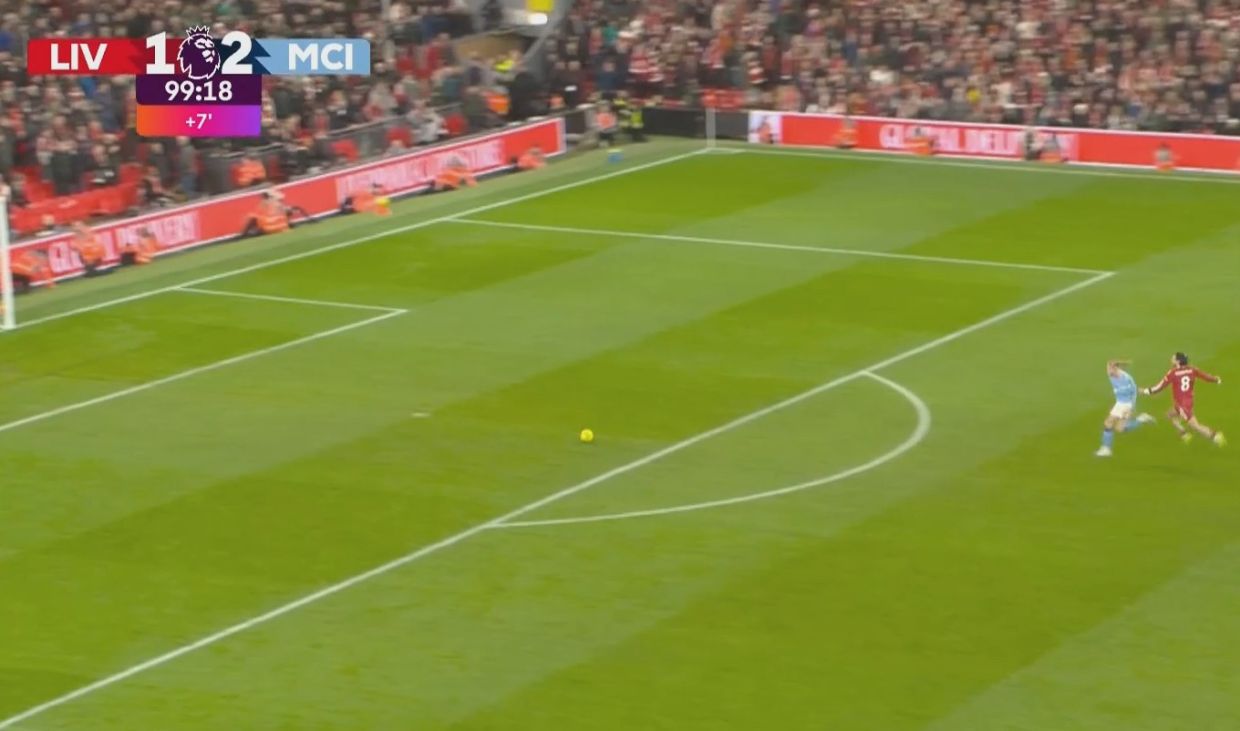 В одном из эпизодов в концовке встречи вратарь мерсисайдцев Алисон Бекер побежал в атаку, оставив ворота пустыми. Футболисты «Манчестер Сити» смогли нейтрализовать угрозу в своей штрафной площади, после чего Шерки точно пробил по воротам «красных». В погоню за мячом устремились нападающий гостей Эрлинг Холанд и хавбек хозяев поля Доминик Собослаи. Из-за фола Собослаи на Холанде гол был отменён, а игрок «красных» удалён с поля.