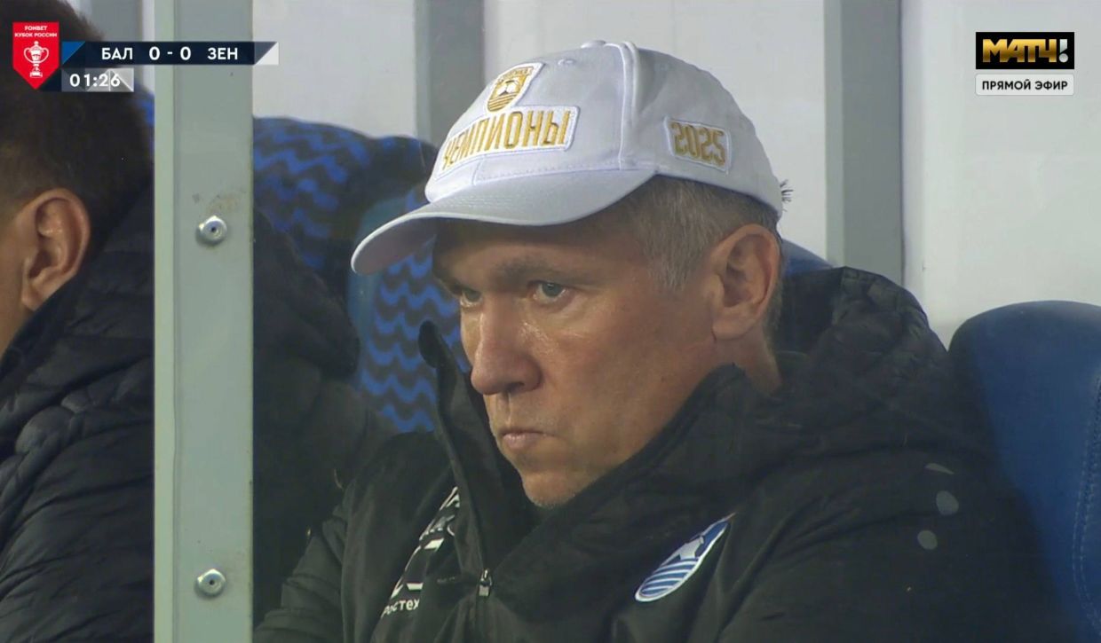 Главный тренер «Балтики» Андрей Талалаев надел кепку с надписью «Чемпионы-2025» на матч второго этапа 1/4 финала Пути регионов Фонбет Кубка России с «Зенитом». На момент выхода новости счёт в игре 0:0.