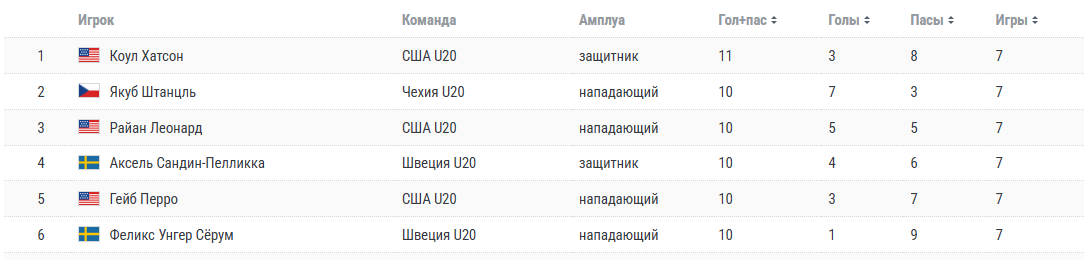 По итогам турнира лучшим бомбардиром стал защитник сборной США Коул Хатсон, набравший 11 (3+8) очков за семь матчей. Второе место с 10 набранными очками разделили пять человек: Якуб Штанцль (Чехия), Райан Леонард (США), Аксель Сандин-Пелликка (Швеция), Гейб Перро (США) и Феликс Унгер Cёрум (Швеция).