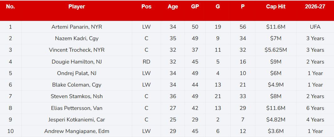 Лидером среди них является российский нападающий «Нью‑Йорк Рейнджерс» Артемий Панарин, контракт которого с клубом истекает летом 2026 года. Отмечается, что статус российского форварда настолько велик, что аналитики портала намеревались отдать Артемию все три первые позиции рейтинга.