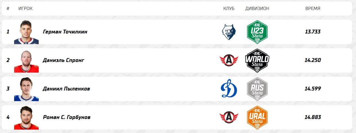 Точилкин показал результат в 13,733 секунды и обошёл Даниэля Спронга (KHL World Stars, «Автомобилист»), Даниила Пыленкова (KHL RUS Stars, московское «Динамо») и Романа Горбунова (KHL Ural Stars, «Автомобилист»).