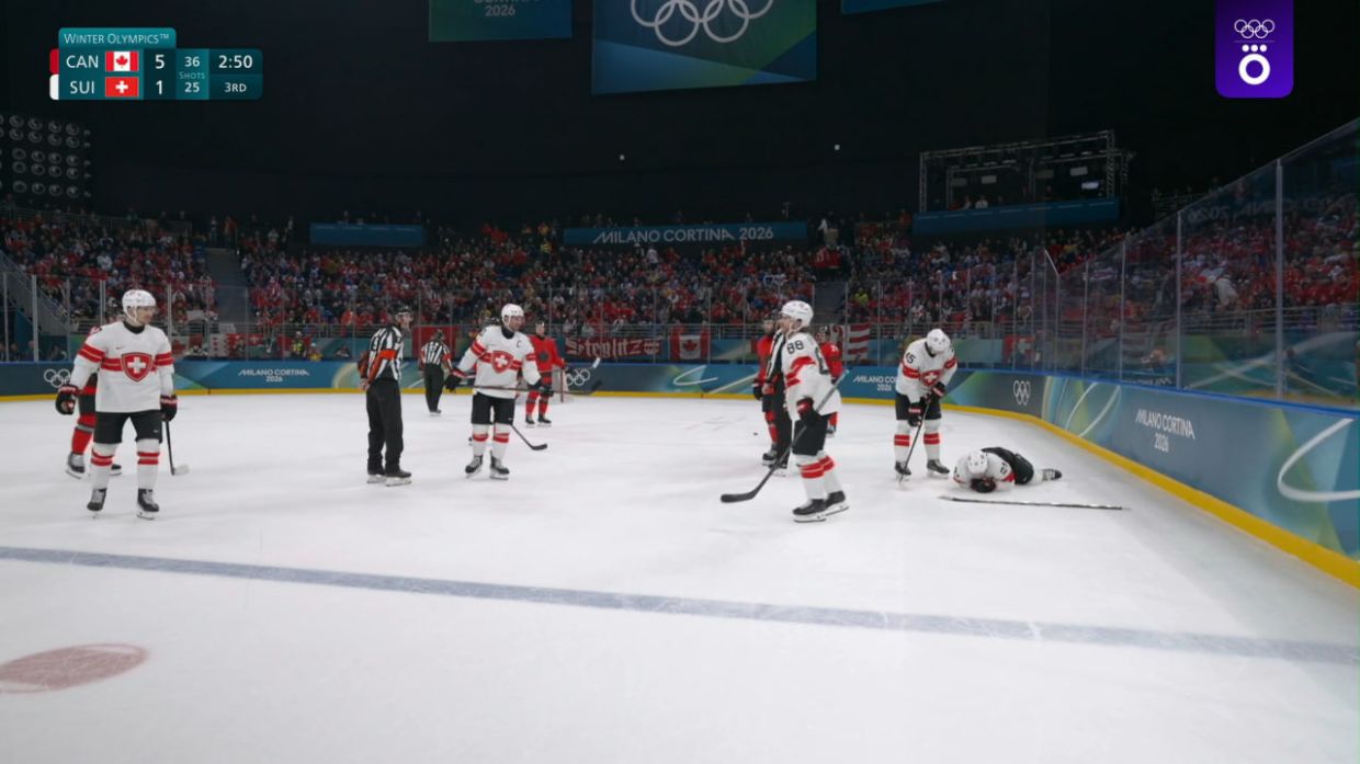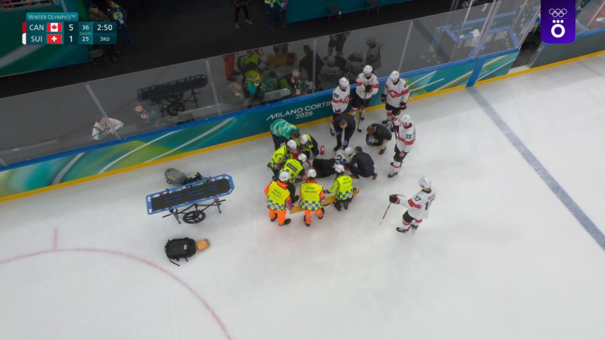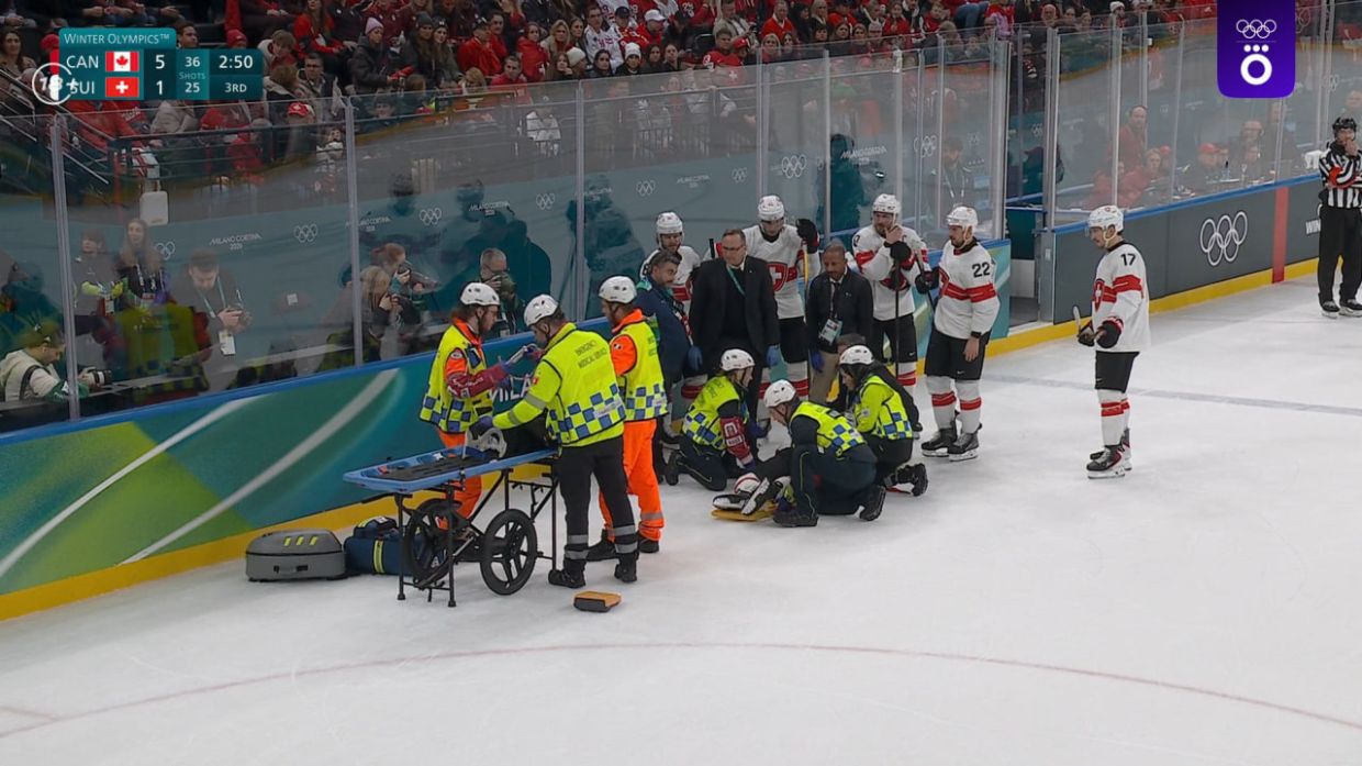 Нападающий сборной Швейцарии Кевин Фиала не смог самостоятельно покинуть лёд после силового приёма от форварда сборной Канады Тома Уилсона. Фиалу увезли на носилках.