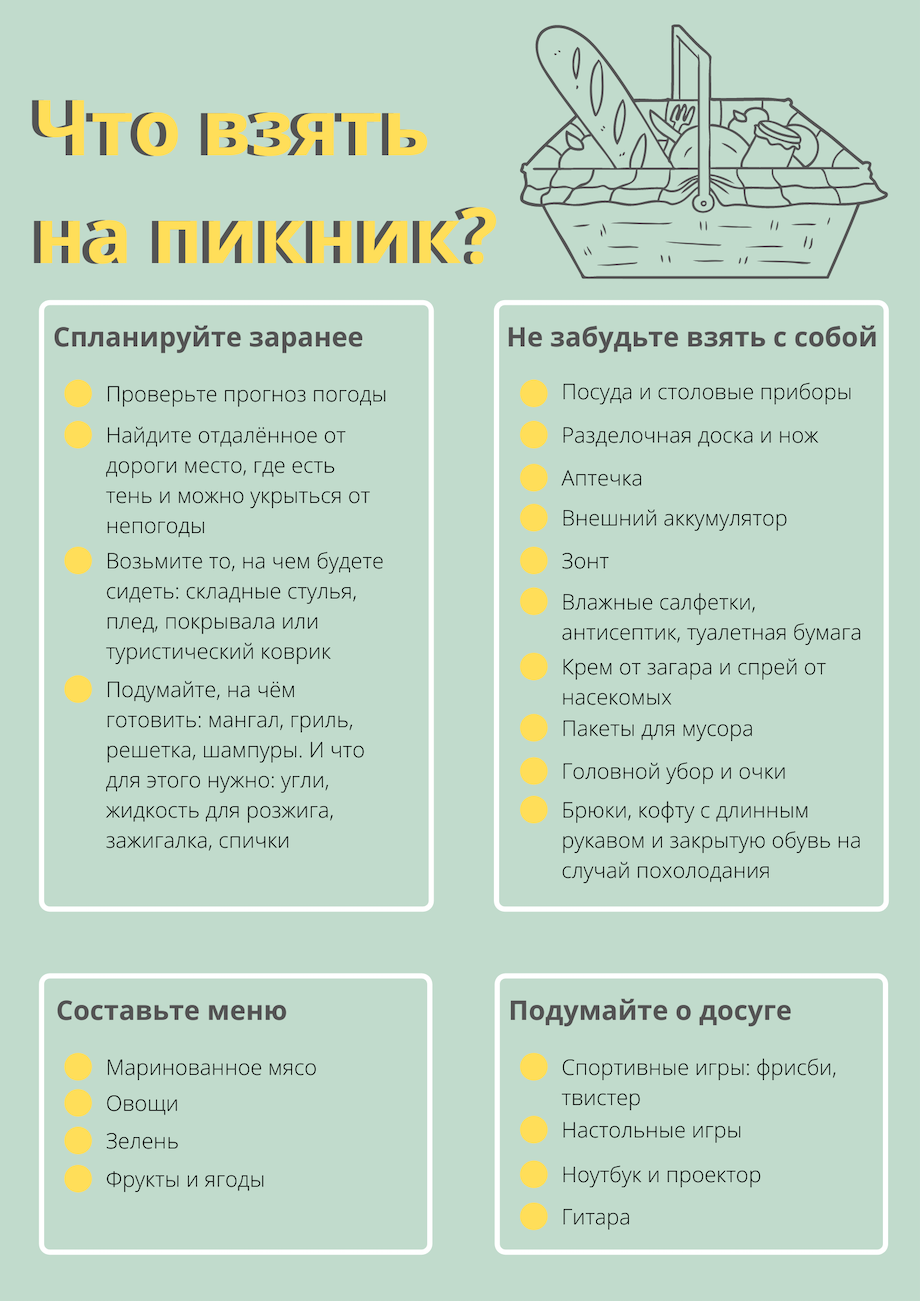 Пока в кафе и ресторанах действуют эпидемиологические ограничения, а МЧС не предупреждает об аномальной жаре, предлагаем выбраться на пикник. Солнце, живописная природа, вкусная еда и освежающие напитки — что может быть лучше? Только пикник, на котором всем будет комфортно и весело, а после не останется лишнего мусора и тяжести в желудке. Рассказываем, как его организовать.