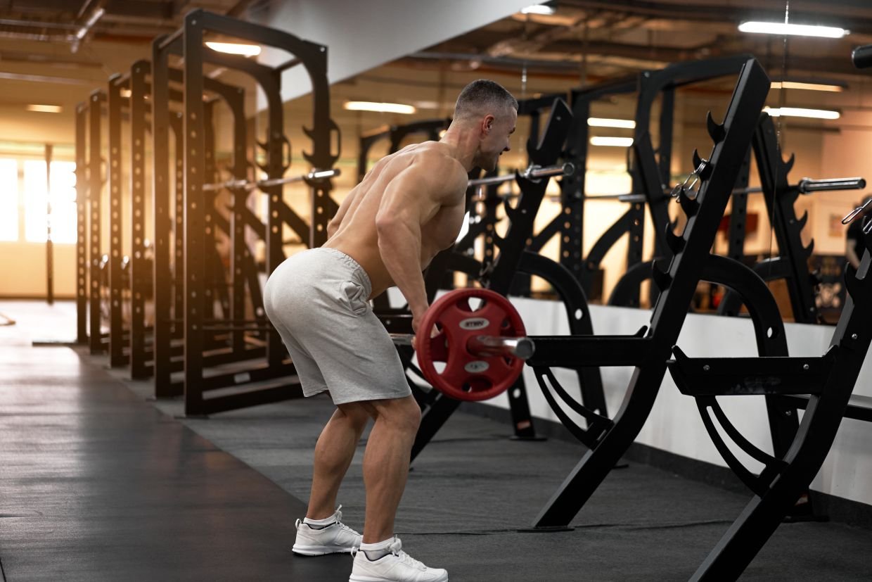 - На выдохе разогнитесь, поднимая штангу вверх до уровня поясницы.