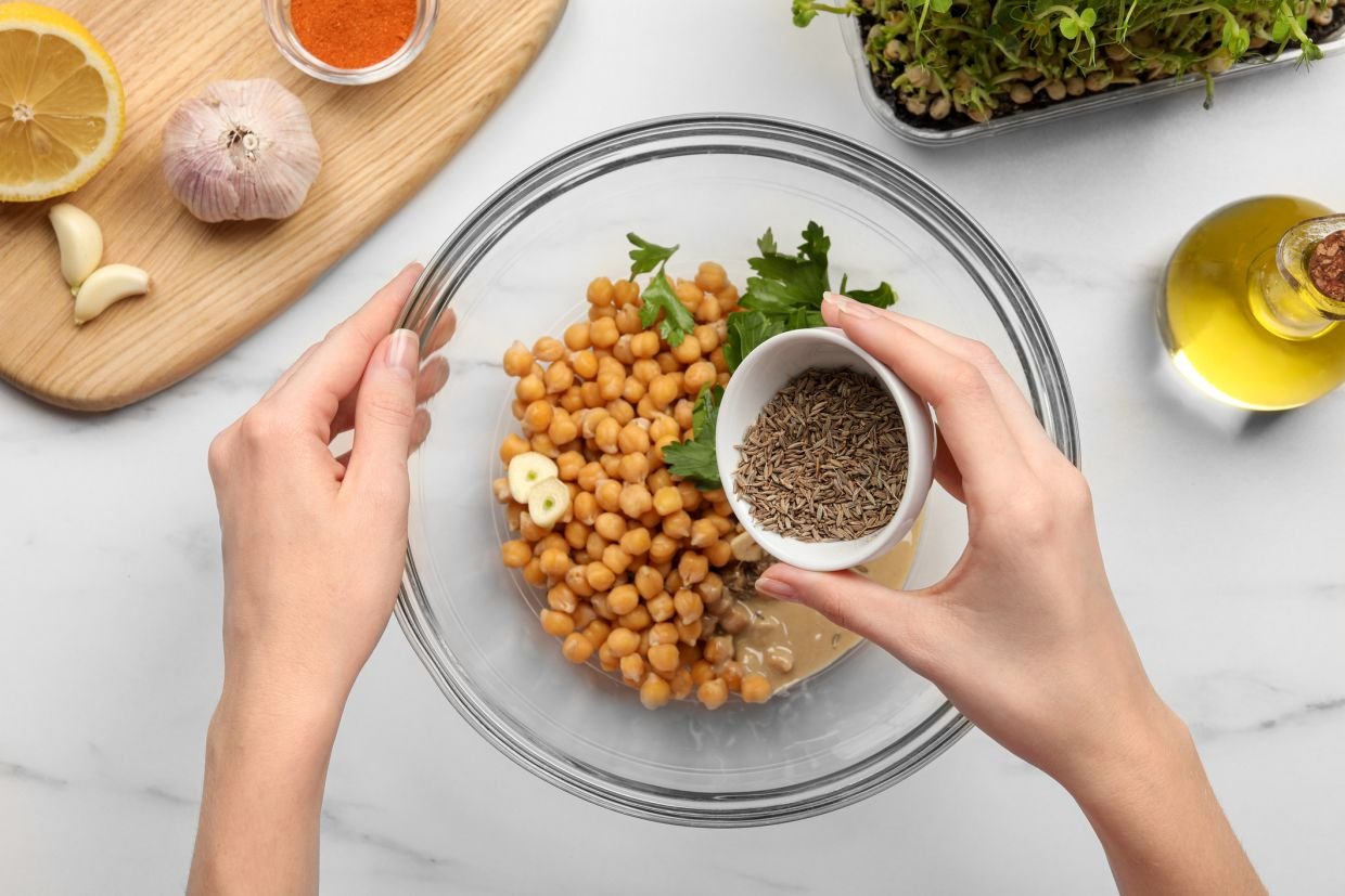 - Все ингредиенты пробейте в блендере, отваром от нута доведите массу до нужной консистенции.