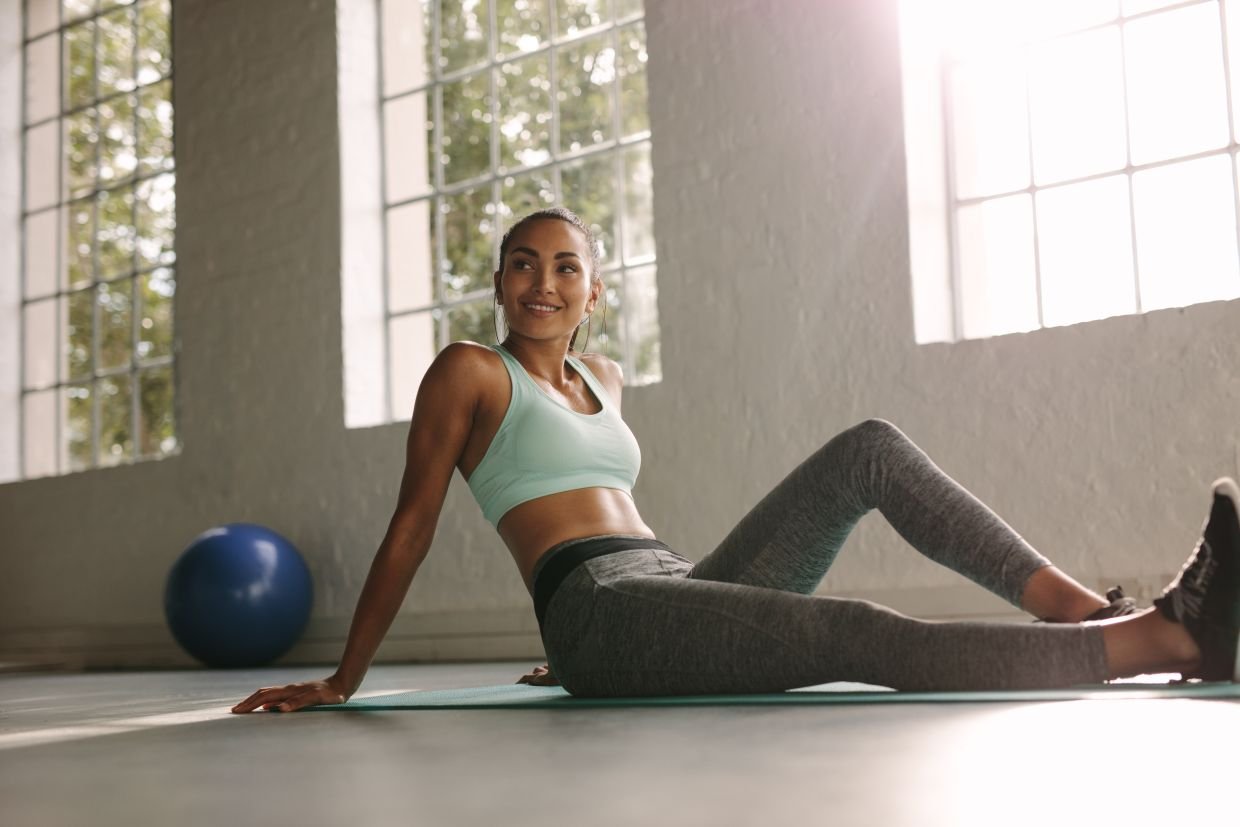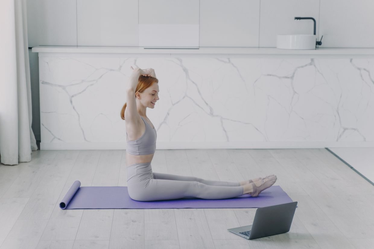 - Исходное положение: сидя на ягодицах, макушка тянется вверх, ноги выпрямлены перед собой. Старайтесь сохранять нейтральное положение позвоночника.