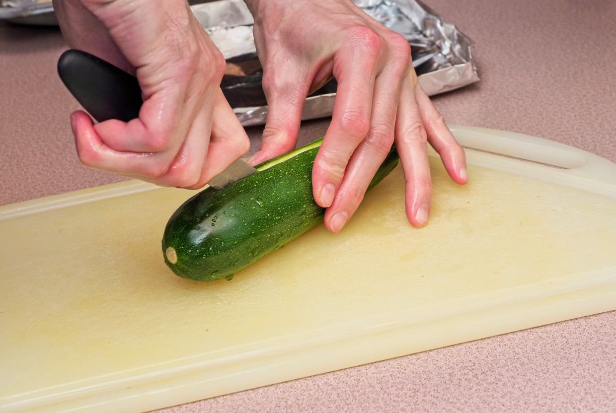 1. Помойте кабачок и нарежьте слайсами вдоль (толщиной 3–5 мм), обжарьте на сухой гриль-сковороде до мягкости.