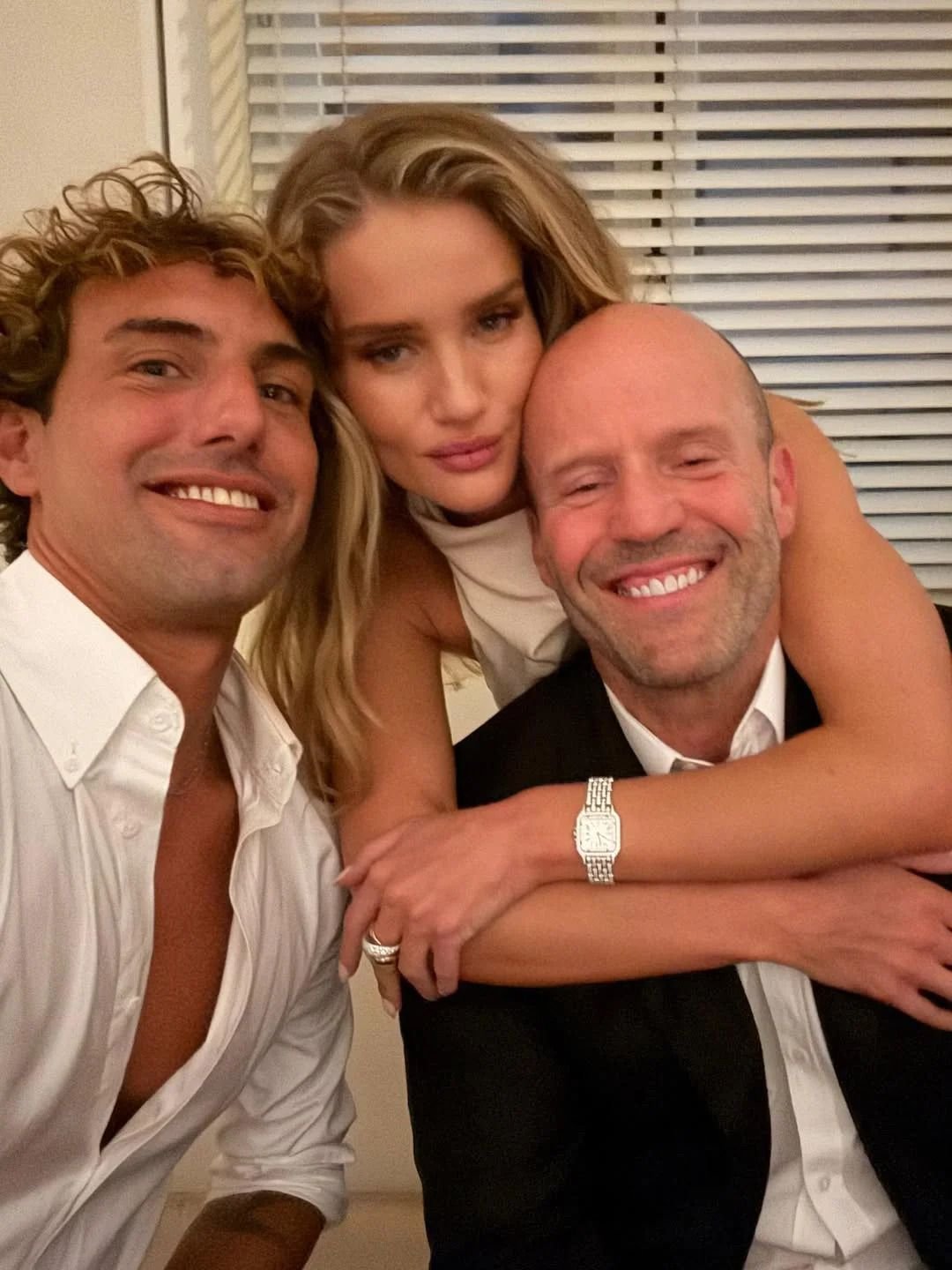 Роузи позировала для фотографии в роскошном белоснежном платье. Идеальным дополнением образа стала укладка с крупными локонами, а также часы и кольцо со сверкающими бриллиантами. Стэйтем же выбрал для светского вечера классический костюм и белую рубашку.