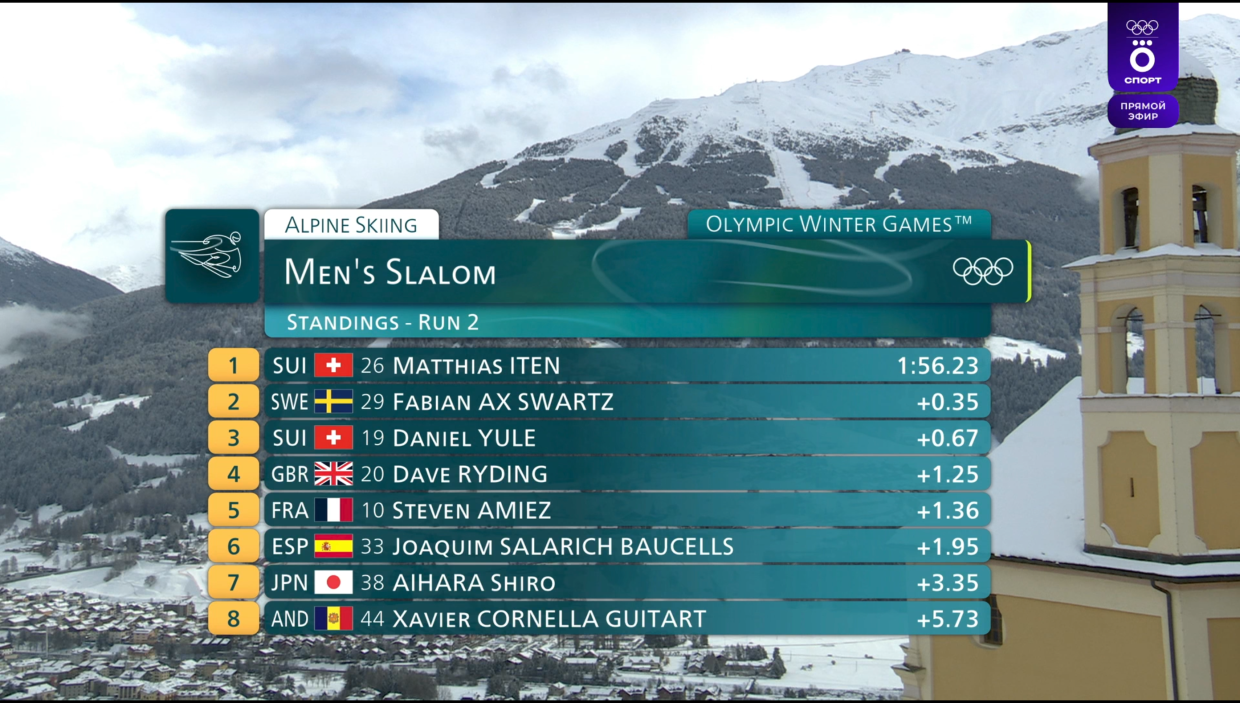 В слаломе на данный момент лучшее время у швейцарца Маттьяса Итена. Но впереди выступление главных фаворитов.