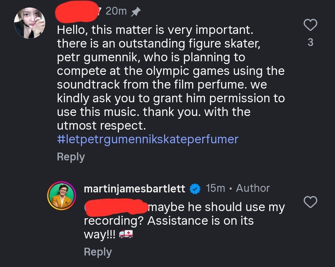 В комментариях под одним из постов Бартлетта в социальных сетях пользователь обратился с просьбой дать разрешение Гуменнику на использование музыки. Под публикациями музыканта пользователи начали распространять хэштег #LetPetrGumennikSkatePerfumer.