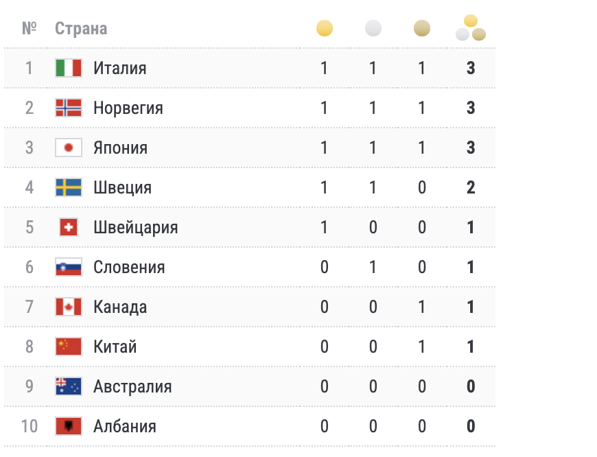 «Чемпионат» предлагает ознакомиться с медальным зачётом на 7 февраля 2026 года: