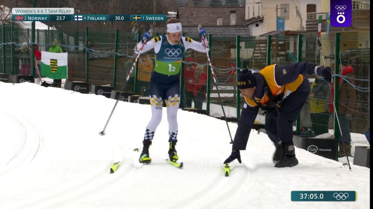 Ранее Андерссон упала на первых километрах своего этапа. На первом этапе за сборную Швеции бежала Линн Сванн, которая передала Андерссон эстафету с отрывом 7,2 секунды от ближайших преследовательниц итальянок. При передаче со второго на третий этап сборная Швеции отставала от лидирующих норвежек на 1.18,4 минуты.