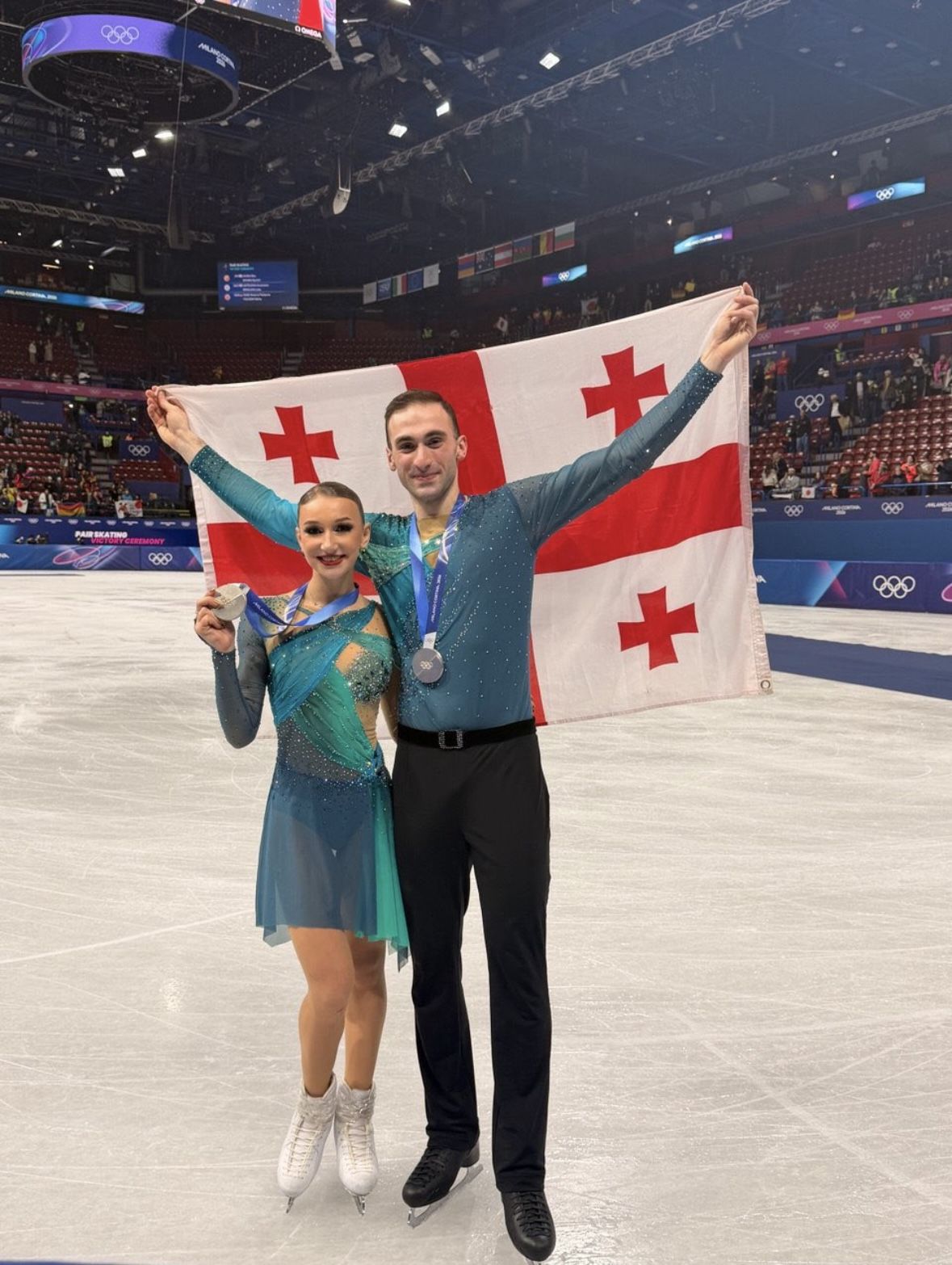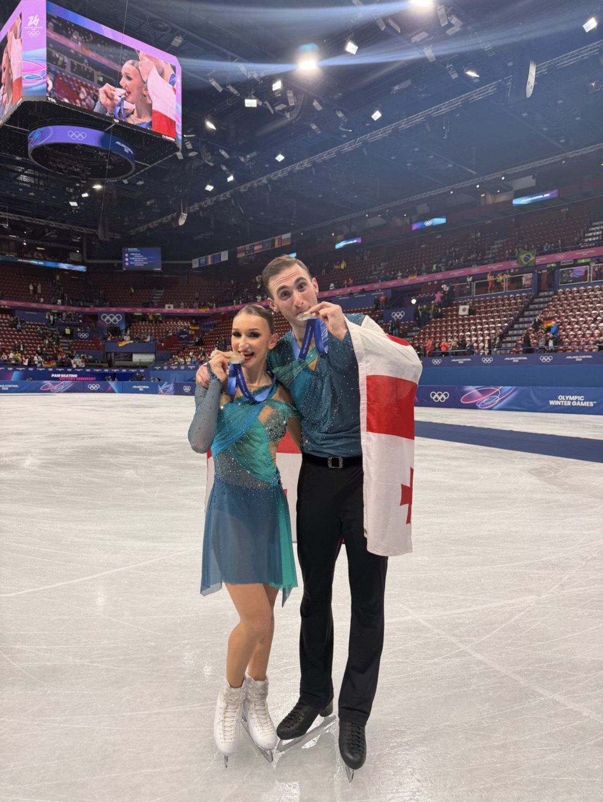 «Мне разрешено плакать?» – подписала спортсменка фотографии, где запечатлена с партнёром после церемонии награждения с медалями и флагом Грузии.