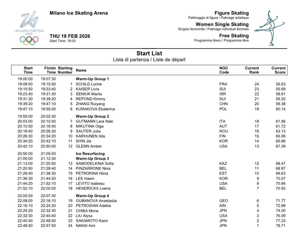 Пресс-служба Олимпийских игр в Милане и Кортина-д'Ампеццо опубликовала полный список и порядок выступления спортсменок в произвольной программе в женском одиночном катании.