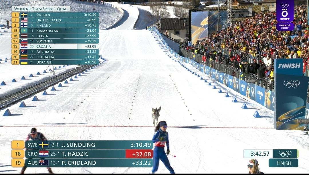 Сегодня, 18 февраля, на зимних Олимпийских играх — 2026 в Италии проходит женский командный спринт свободным стилем. На финишной прямой на трассу выбежала собака и попала в объектив фотофиниша.