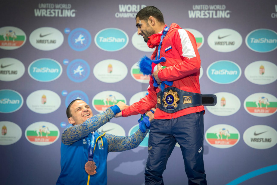 Пока же у россиян только одна награда от Степана Маряняна… Хотя постойте, был же вчера ещё один обладатель российского паспорта, получивший в пятницу бронзовую медаль! Хороший борец, неплохо выступил на чемпионате России-2017, тогда же привлекался к тренировкам национальной команды и совершенно точно присутствует в списочном составе сборной одного из регионов Российской Федерации на 2018 год. Посмотрите, как он радуется своей бронзовой медали – первой в своей карьере такого уровня. Только постойте… как же так… он что – в форме сборной Украины?! Стоит на одном пьедестале с Маряняном?