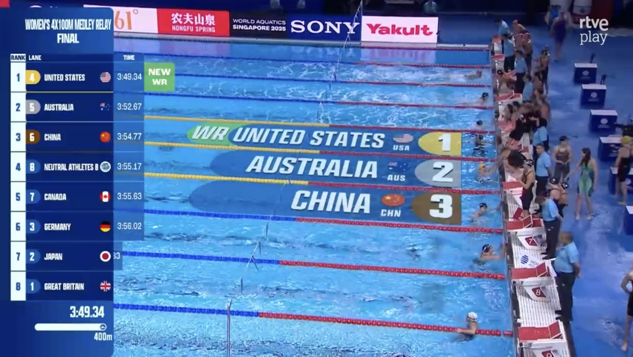 А вот США не просто победили, а ещё и обновили собственный мировой рекорд — 3:49.34.