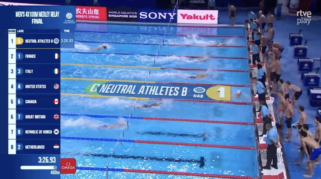 Последний комплект наград ЧМ-2025 в Сингапуре — женская комбинированная эстафета 4х100 м. Россиянки плывут по восьмой дорожке. Удачи!