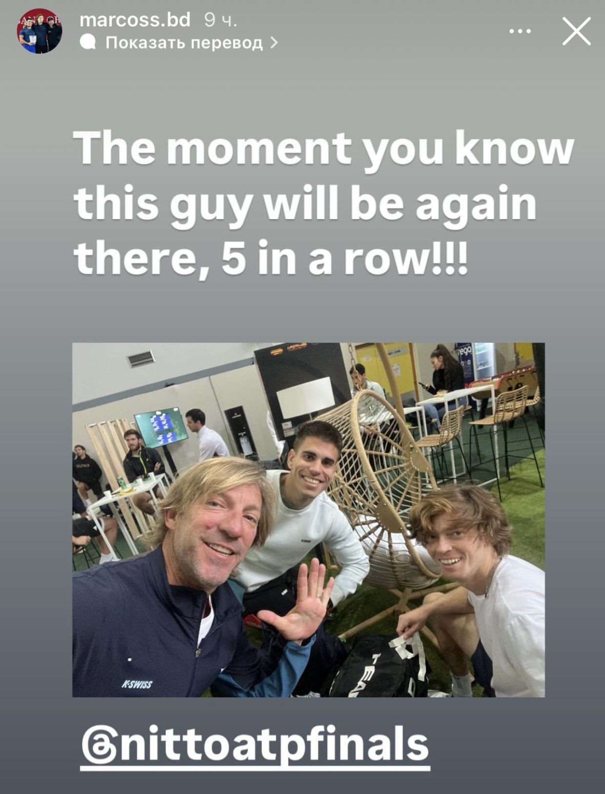 Тренер девятой ракетки мира российского теннисиста Андрея Рублёва Маркос Бордериас высказался о квалификации своего подопечного на Итоговый турнир ATP — 2024, который пройдёт в Турине (Италия) с 10 по 17 ноября. Соответствующую фотографию с Андреем он выложил на личной странице в социальных сетях.