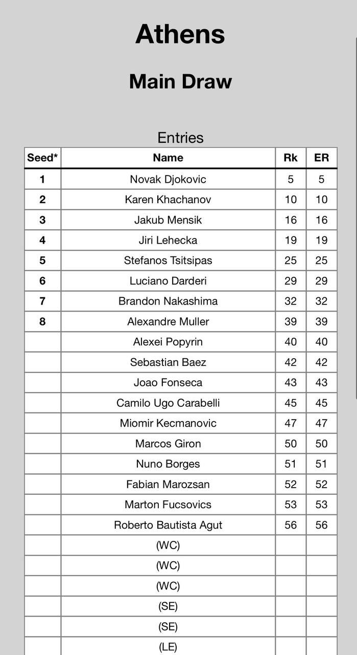 Стал известен заявочный лист турнира категории ATP-250 в Афинах (Греция), который пройдёт со 2 по 8 ноября.